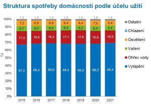 Čtyři pětiny veškeré energie spotřebují české domácnosti na vytápění a ohřev vody. Zbývající část tvoří spotřeba na osvětlení, vaření, chlazení a ostatní užití. K vytápění